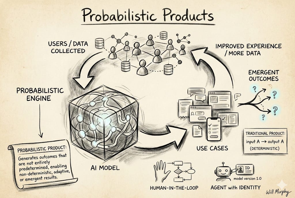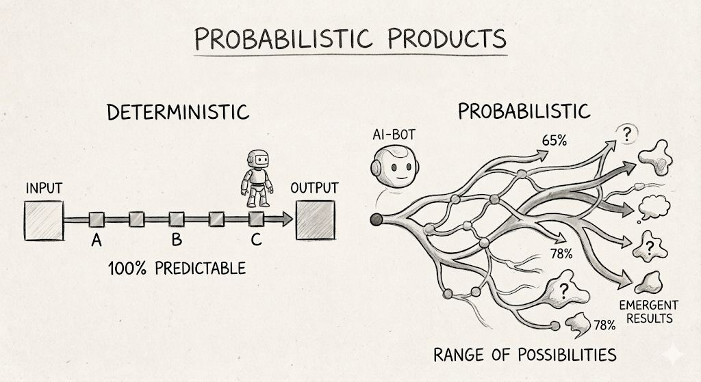For years, we built deterministic products—input A and B, then expect C behavior and output. That’s what I was used to. But I sensed a shift. A new era of product and product management was dawning, one driven by probabilities rather than certainties. I believe that as AI continues to evolve, probabilistic products will become central to taking AI and applying it to use cases. But what exactly is a “Probabilistic Product”?